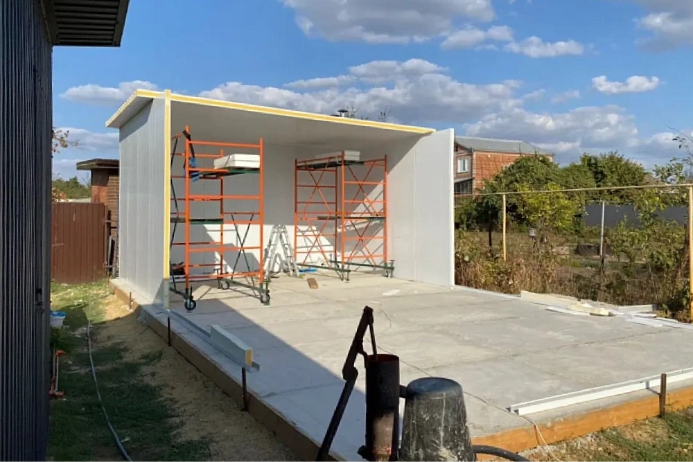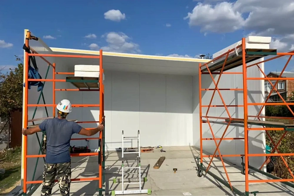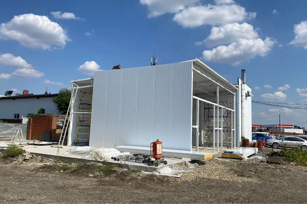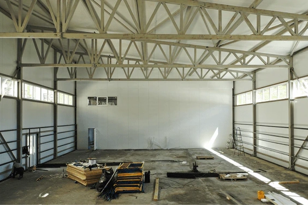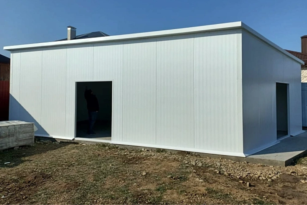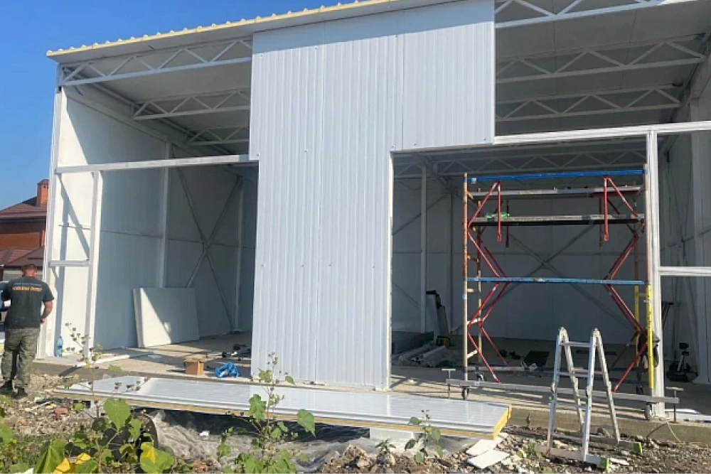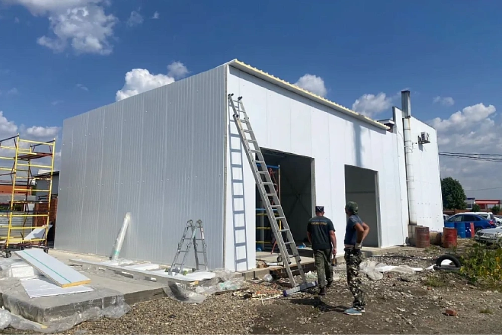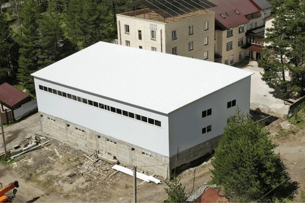 Выполнен выезд на объект для замера и детального согласования пожеланий заказчика. Разработан индивидуальный проект с учетом требований сейсмической зоны. Осуществлено изготовление сборно-разборного металлокаркаса, стеновых и кровельных сэндвич-панелей PIR толщиной 80 мм. Выполнена поставка и монтаж металлоконструкций, сэндвич-панелей, а также установлены входные группы, ПВХ-окона и противопожарные двери. Проведен полный цикл работ – от каркаса до финишной установки всех конструктивных элементов.