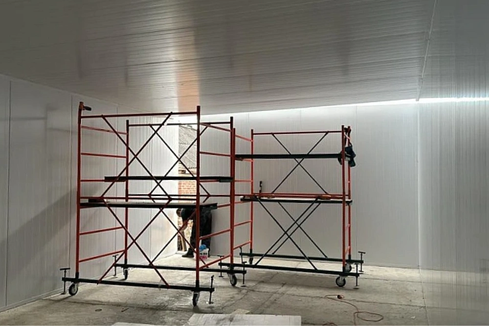 Изготовление, доставка и монтаж сэндвич-панелей PIR, толщиной 150 мм. Выполнен монтаж металлокаркаса и низкотемпературных холодильных дверей на объекте. Металлический каркас по проекту выведен снаружи, чтобы избежать любых мостов холода. Средняя температура эксплуатации камер -30 ℃.